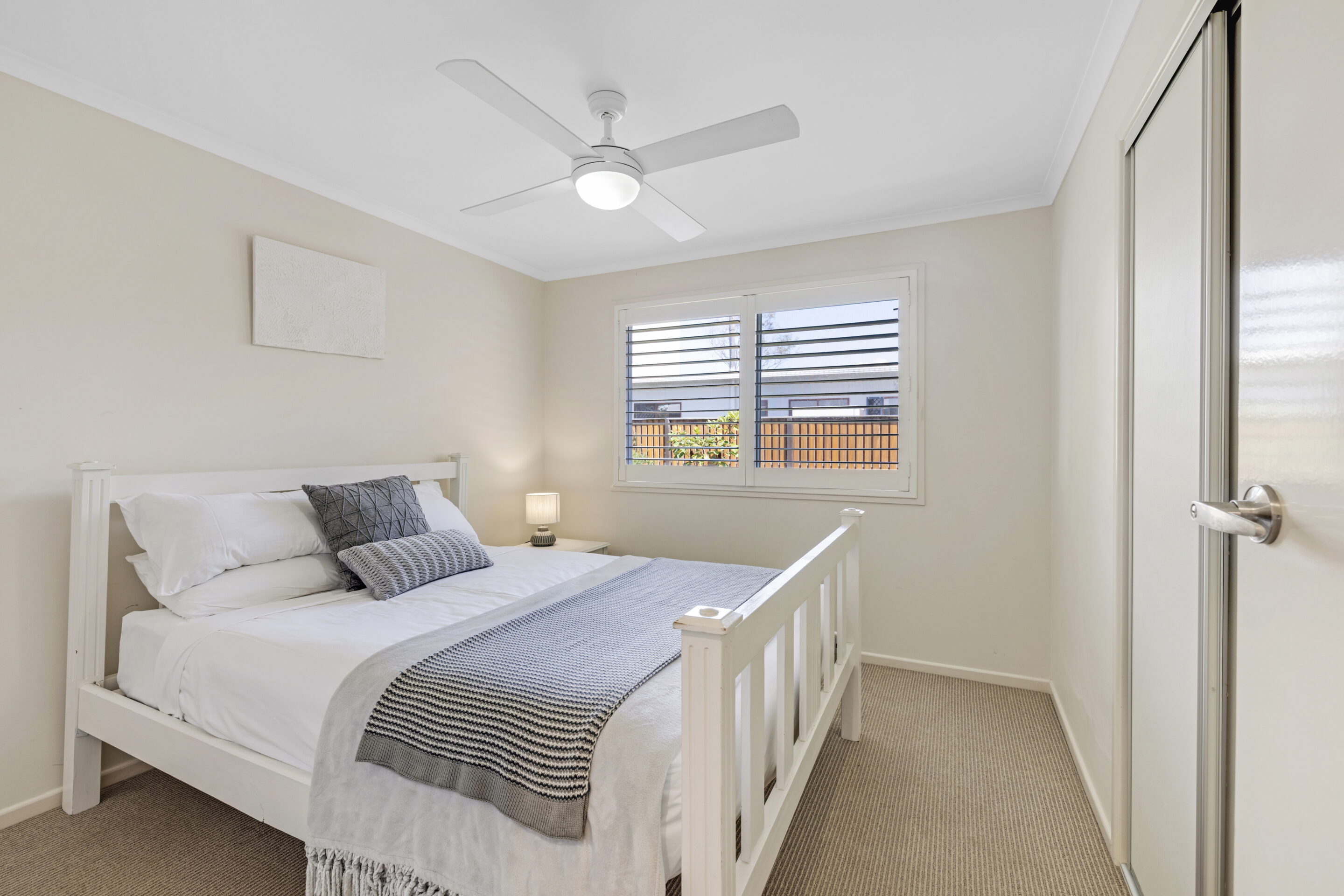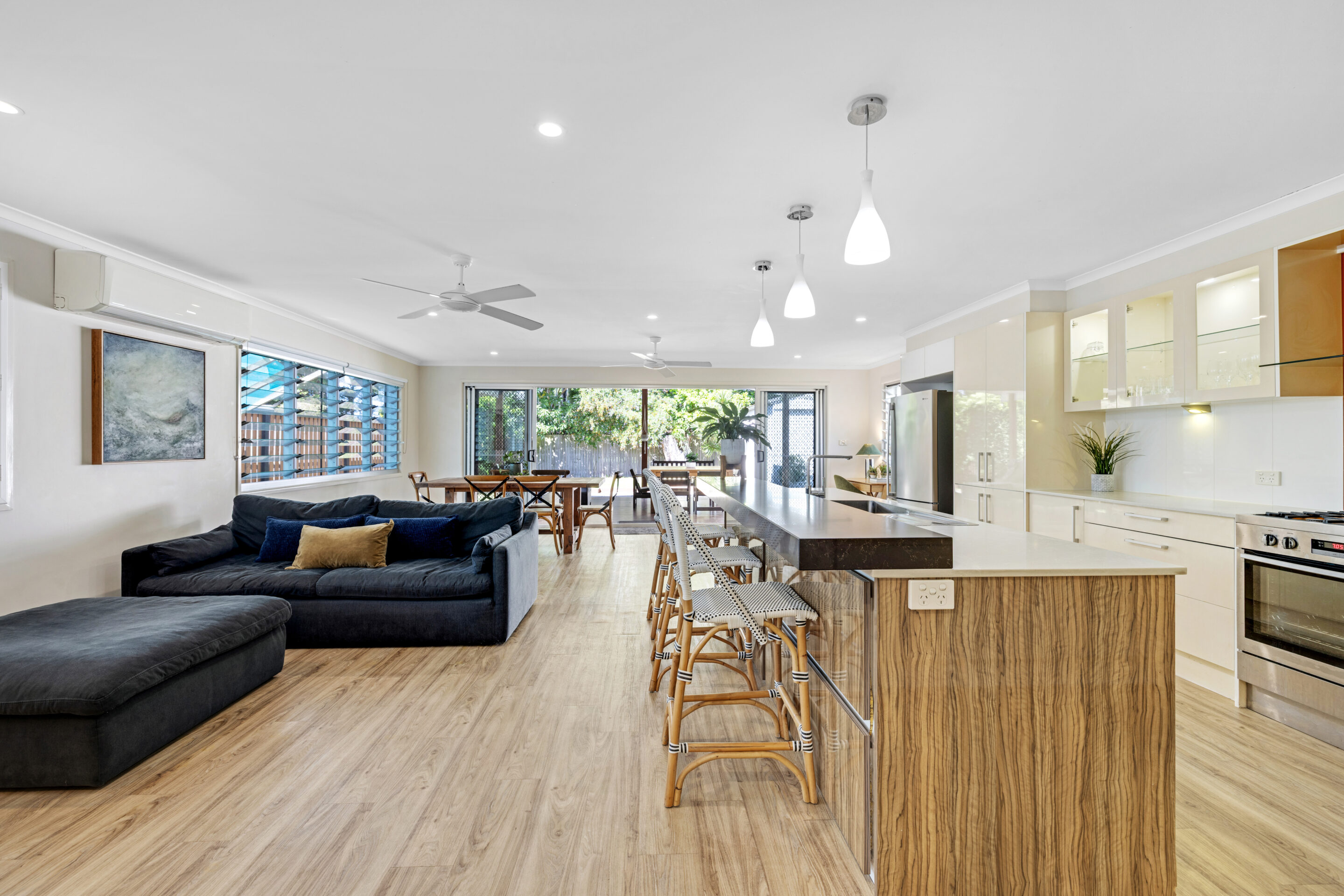 The interior features stylish floating floorboards, plantation shutters throughout, and louvered windows that capture the coastal breezes. Ceiling fans and a split system air conditioning unit in the main living area ensure year-round comfort. The well-appointed kitchen provides ample storage and connects seamlessly to the living space, creating a practical and inviting hub of the home.